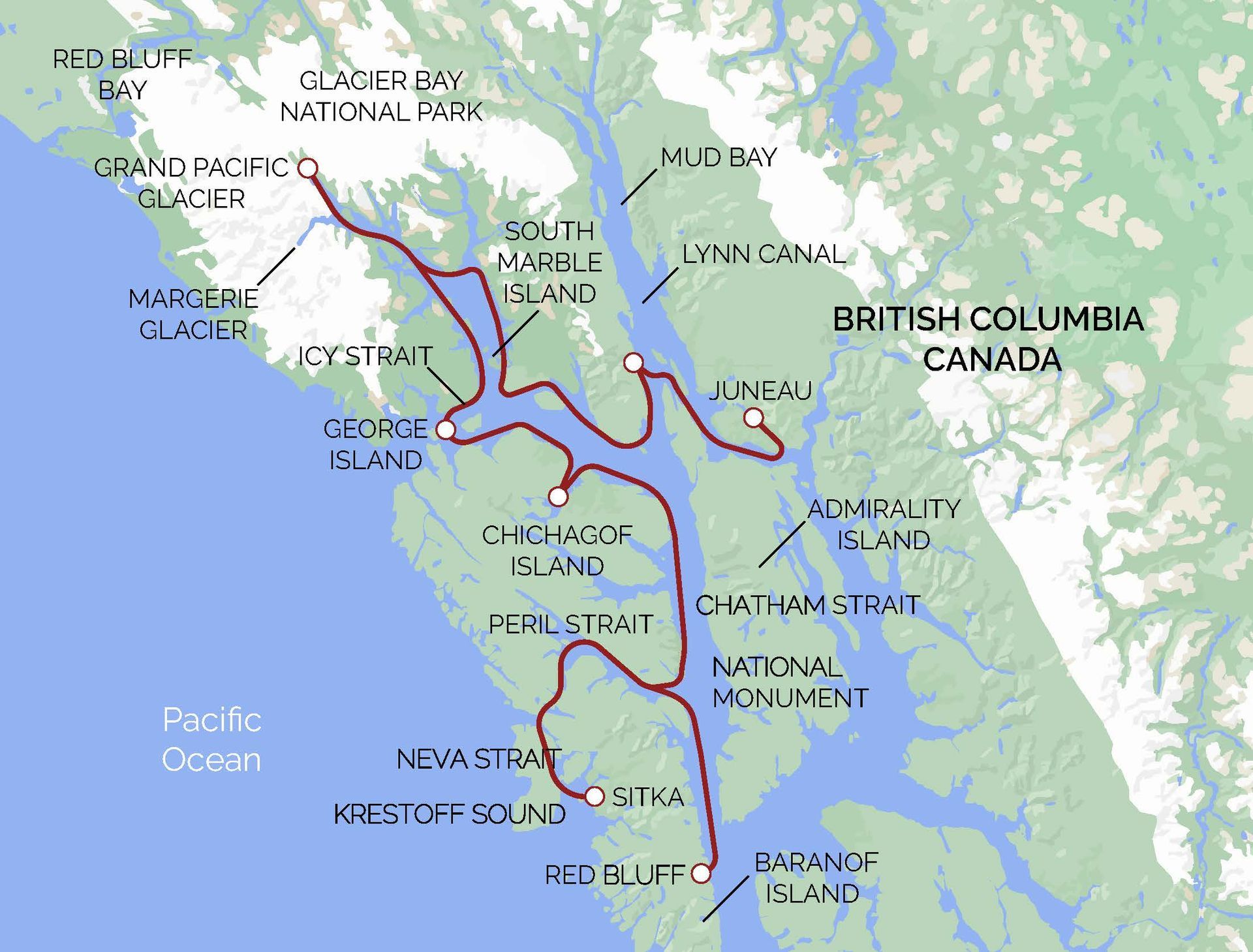 Baranof Island is our playground for the day. Glacially carved fjords become more exposed as we approach South Baranof Wilderness. We continue our search for the coastal brown bear and bushwhack up into muskegs that offer sweeping views across Chatham Strait towards Kootznoowoo. Whales transit the coastline in search of schools of herring and salmon that gather here in numbers beyond comprehension. Following the spouts west, we enter Peril Strait – an infamous stretch of water rich in indigenous and Russian history. Tight channels and swirling eddies bring marine mammals to the area, here to take their chances at salmon returning to their natal streams.